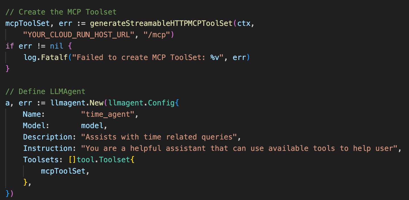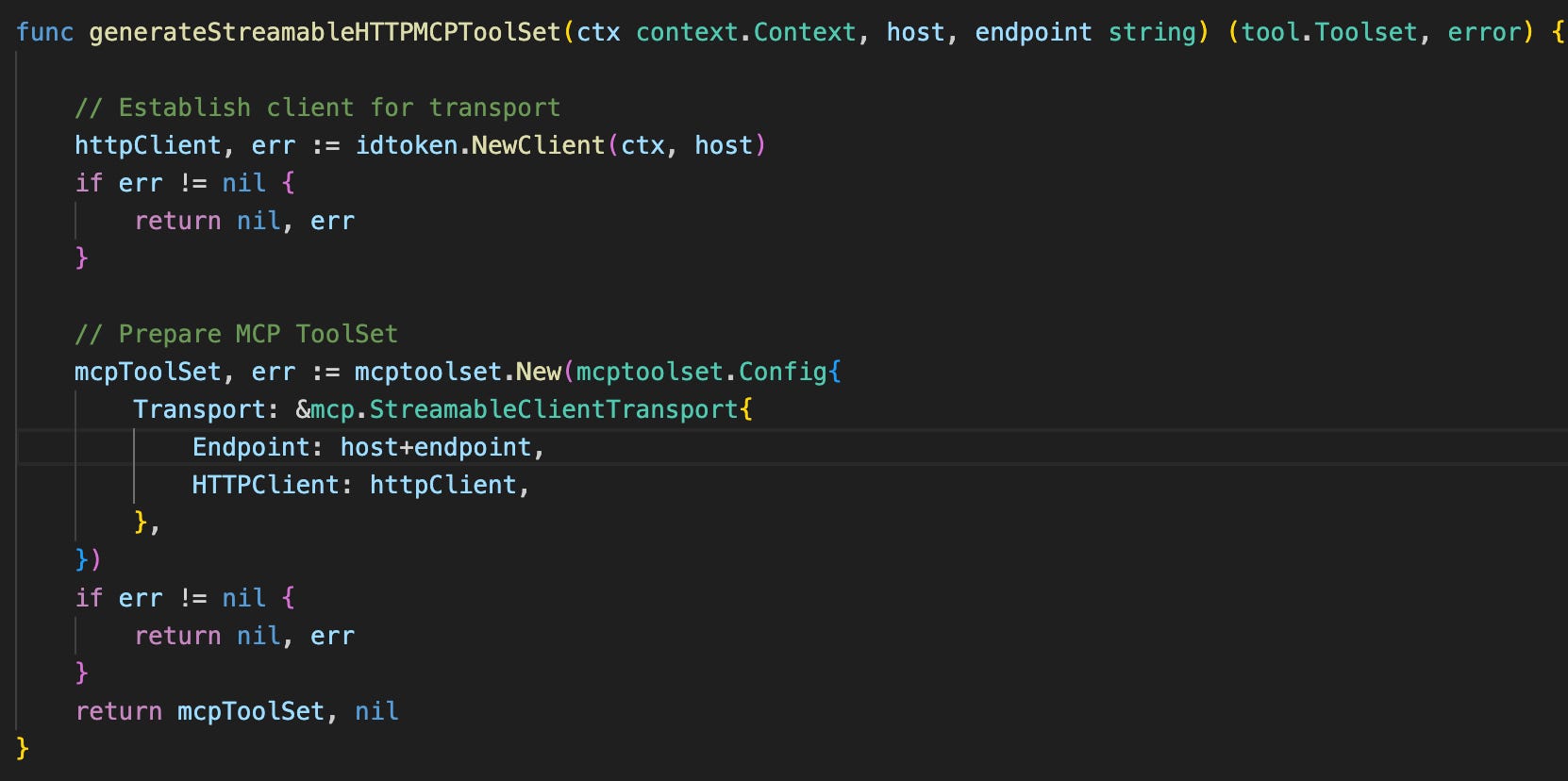 Once we have the MCP server deployed, we need to configure the ADK agent to connect with it. ADK provides the MCPToolset with StreamableHTTP transport configuration to help with this (i.e. providing the MCP Client connection). Note the replacement of the transport’s default HTTP client with the dedicated one created via idtoken.NewClient. This HTTP client automatically generates the correct ID token and add this as an “Authorization” header for each request to the MCP server. This is required to authenticate the agent to the Cloud Run service.