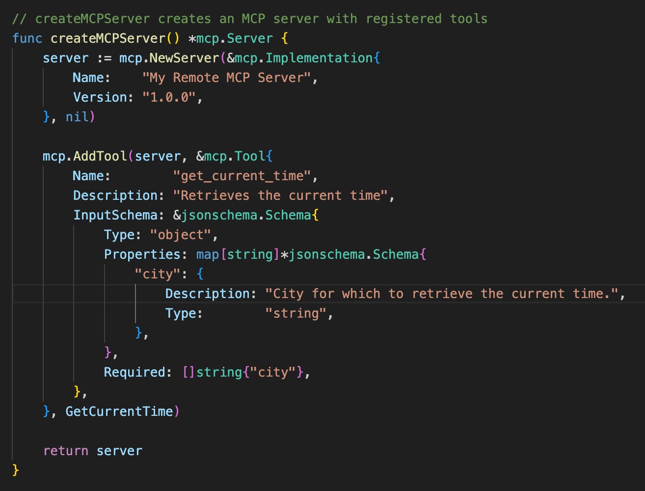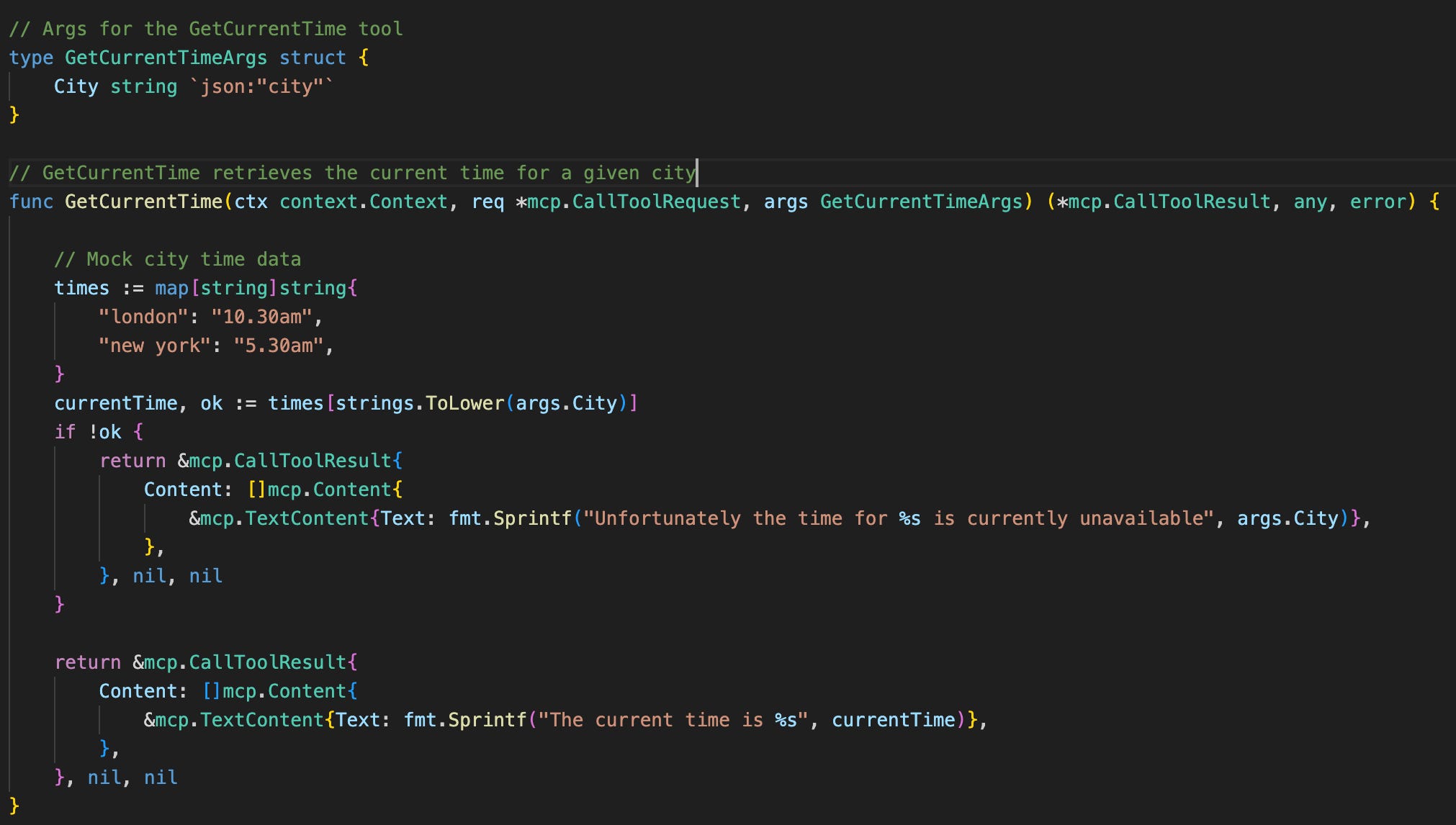 The first step is to define some capabilities (i.e. tools) on the MCP Server. To keep things simple, we define a single GetCurrentTime tool function which accepts a structured “city” parameter and returns the current time information for the specified city: